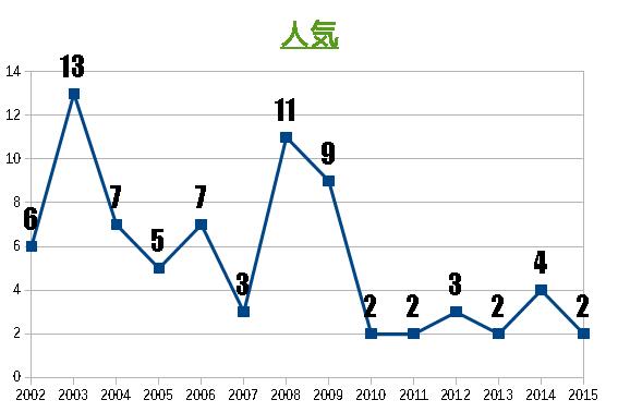 | 2005 | 6 | 8 | ヒシミラクル | 角田晃一 | 佐山優 | 栗東 | 468 | 12 | 2 | 5 | 牡 | 1 | 6 |